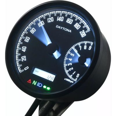 Daytona Velona W MC speedometer byder på et flot sort klassisk 80mm rundt ur-hus med analog viser til både hastighed og omdrejningstæller.